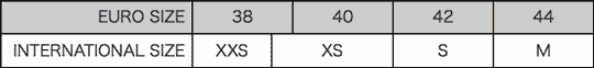 ![]() 上記サイズチャートは、ヨーロッパ仕様のアパレルの為、目安となります。体形には個人差がありますのでサイズをお確かめのうえお求めください。 |